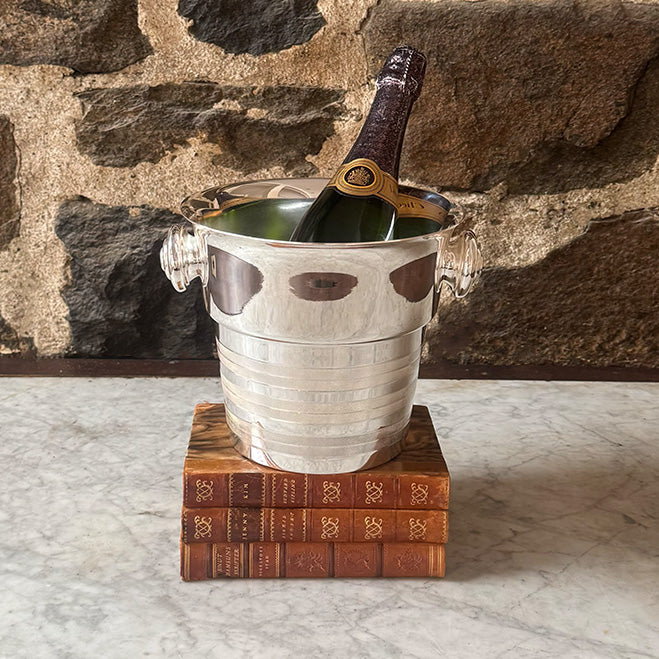 This Vintage French Deco Champagne Bucket is stunning with its stepped profile , engine-turned bands and concentric knob handles. It makes a sleek accessory for a bar to chill a bottle of bubbly or favorite wine.