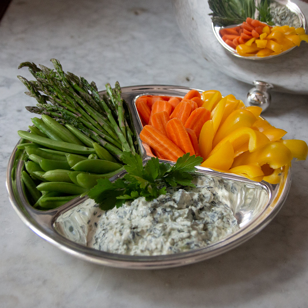 It's the perfect vessel for serving trios of appetizers such as tortilla chips, guacamole & salsa, colorful crudité with dip, olives, nuts and potato chips. Or, for an assortment of berries, chocolates and cookies at dessert time.