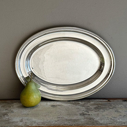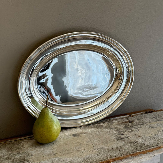 This Vintage 12" Oval Platter is a classic in our collection of restored and re-plated European hotel silver.  We love the simplicity of its streamlined design with rolled rims.
