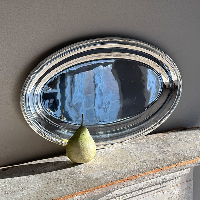 We love the look of this oval tray kept upright against a kitchen backsplash when not in use for entertaining - adding a touch of silver chic and reflection in a room.