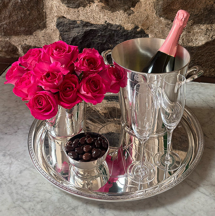 The vintage offerings in our curated collection of European hotel silver and barware are restored and re-plated in pure silver in London by our longtime silversmiths. Even with restoration, some of the pieces may sport more patina than others due to their unique history and use which we think only adds to their character and allure.