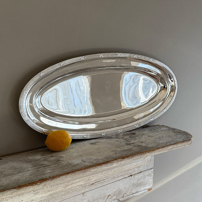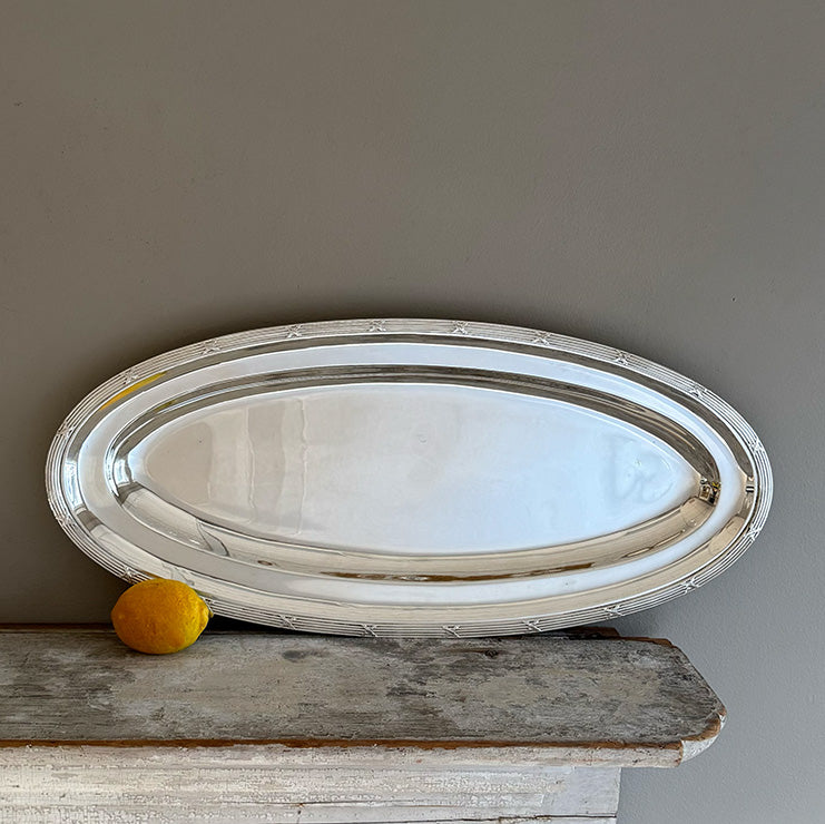 Imagine a perfectly poached salmon atop this tray styled with fresh green sprigs of watercress and slices of lemon.