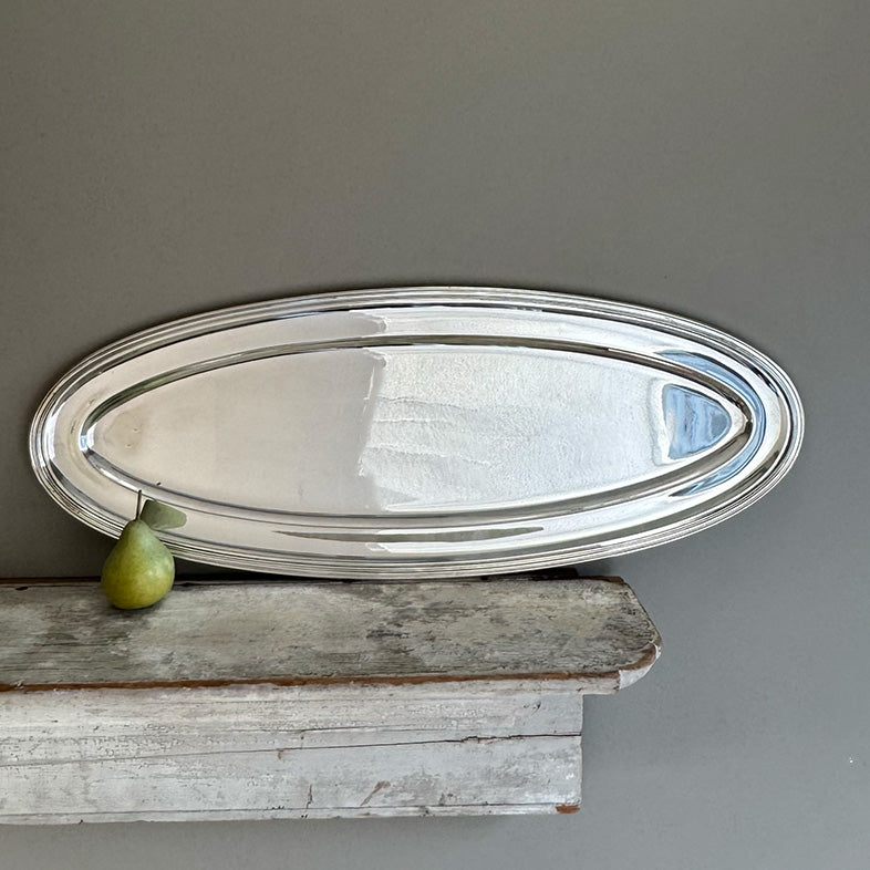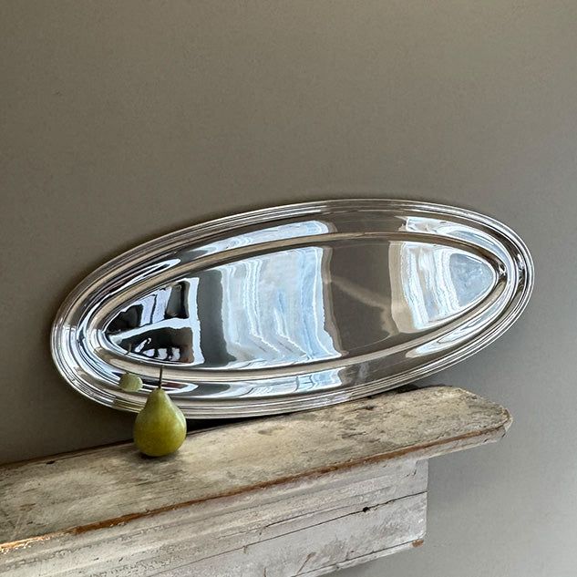 This stunning 27" Oval, Narrow Platter sports the esteemed stamp of Christofle, France.