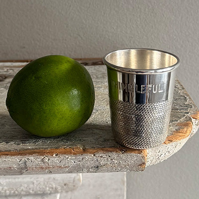 We love this Vintage Bar Jigger in the form of a sewing thimble.  "JUST A THIMBLEFUL"is engraved around the top of the jigger. We have 2 of these collectible bar accessories on hand.
