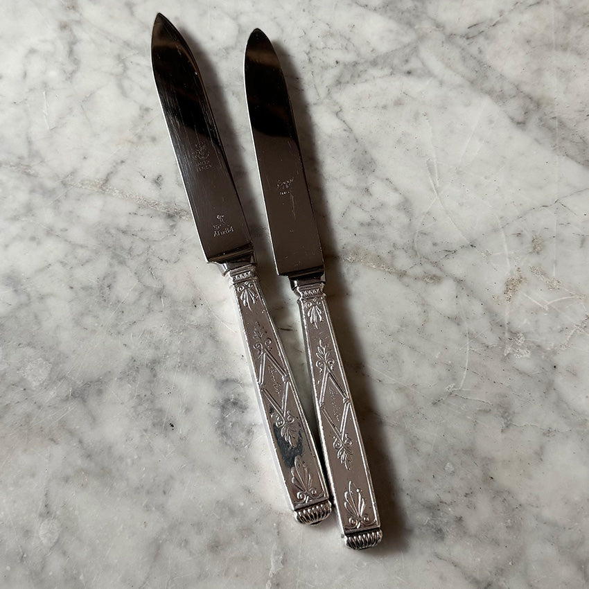 Today, we'd use these stunning knives as chic spreaders for jam on morning toast, paired with one of a kind vintage lunch forks for salad or with cheese and crackers at cocktail time.