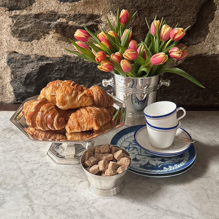 The vintage offerings in our collection are restored and re-plated in pure silver in London for us by our longtime silversmiths. Even with restoration, some of the pieces may sport more patina than others due to their unique history and use which we think only adds to their character and allure.
