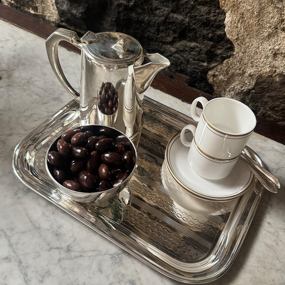 We love this size tray for serving hors d'oeuvres, 2 cups of coffee or tea, 2 cocktails or sweets. When not in use for entertaining, we leave trays upright against a kitchen or bar backsplash to add a touch of silver chic to the room.