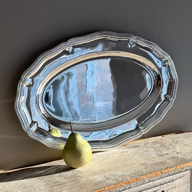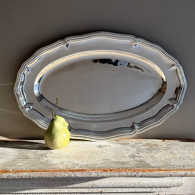 This Vintage 17.5" Oval Platter with Scalloped Rims is a classic. Elegant and streamlined, it adds a sophisticated touch of silver to one's entertaining arsenal.